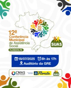 A Prefeitura de Floresta, por meio do Conselho Municipal de Assistência Social (CMAS), em parceria com o Sistema Único de Assistência Social (SUAS), convida toda a população para participar da 12ª Conferência Municipal de Assistência Social, que acontecerá no dia 18 de julho de 2025, das 8h às 17h, no Auditório da GRE de Floresta.