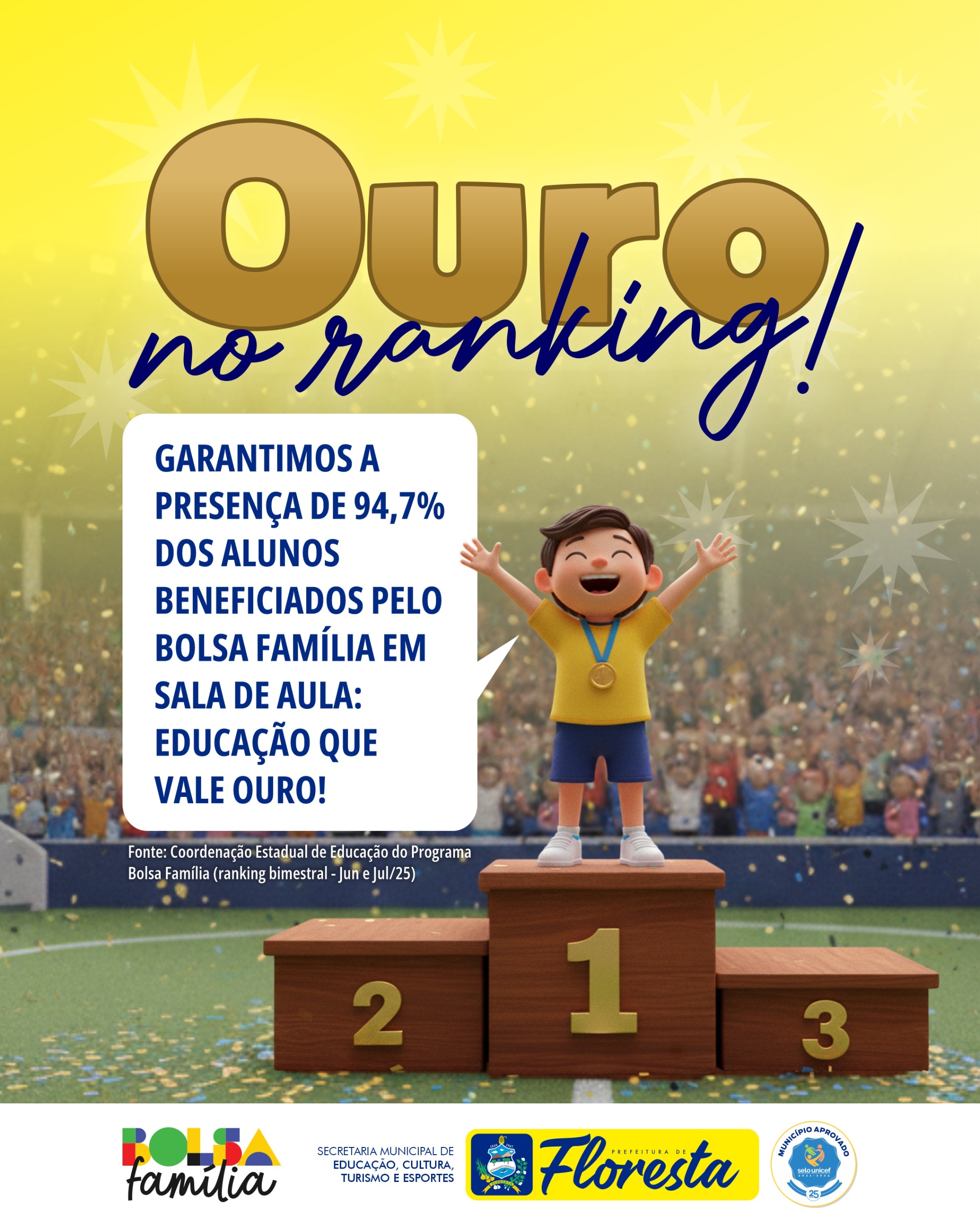 Floresta se destacou no ranking bimestral de junho a julho de 2025, alcançando a impressionante marca de 94,70% de registros de frequência escolar dos estudantes do Programa Bolsa Família no Sistema Presença. Esse excelente resultado é fruto do compromisso, cuidado e dedicação diária da Prefeitura de Floresta, através da Secretaria Municipal de Educação, Cultura, Turismo