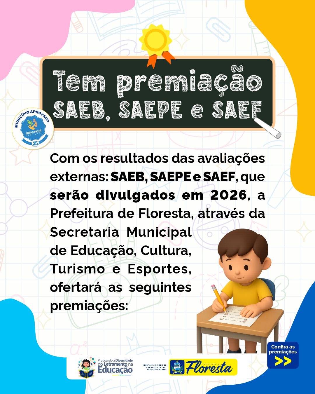 Com base nos resultados das avaliações externas (SAEB, SAEPE e SAEF), que serão divulgados em 2026, a Prefeitura de Floresta, por meio da Secretaria Municipal de Educação, vai promover importantes incentivos para valorizar o esforço da rede municipal de ensino. As premiações são: – Vale Gestão: R$ 800,00 para escolas com 95% ou mais de
