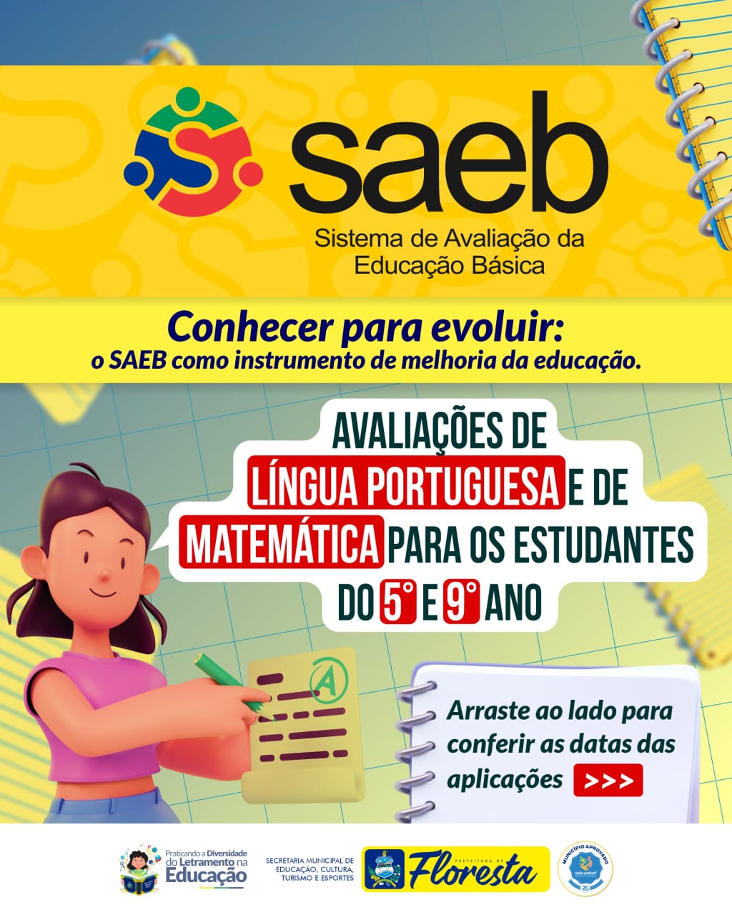 A Prefeitura de Floresta, por meio da Secretaria Municipal de Educação, realizará nos dias 21 e 22 de outubro a aplicação das avaliações do SAEB – Sistema de Avaliação da Educação Básica, com foco nas disciplinas de Língua Portuguesa e de Matemática. A iniciativa é voltada para os estudantes dos 5º e 9º anos do