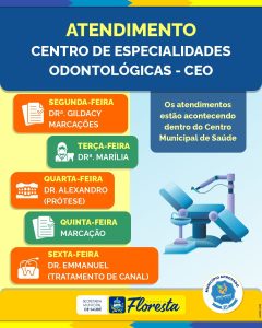 O Centro de Especialidades Odontológicas (CEO) de Floresta está funcionando, atualmente, nas dependências do Centro Municipal de Saúde, oferecendo atendimento odontológico especializado de segunda a sexta-feira.