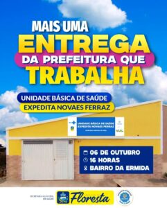 A Prefeitura de Floresta, por meio da Secretaria Municipal de Saúde, convida a população para a inauguração da nova Unidade Básica de Saúde (UBS) Expedita Novaes Ferraz, que acontecerá no dia 06 de outubro, às 16h, no bairro da Ermida.