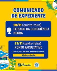Em conformidade com o Decreto nº 85/2025, a Prefeitura de Floresta informa que a próxima sexta-feira, 21 de novembro, será ponto facultativo, seguindo o feriado do dia 20 de novembro, data dedicada à Consciência Negra e marcada pela memória da morte de Zumbi dos Palmares, líder do Quilombo dos Palmares e símbolo da luta contra a escravidão no Brasil.