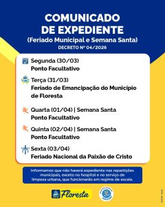 A Prefeitura de Floresta informa que não haverá atendimento ao público nos órgãos e entidades da administração municipal no período de 30 de março a 03 de abril de 2026. A suspensão das atividades ocorre em razão do Feriado de Emancipação do Município de Floresta e das celebrações da Semana Santa, conforme estabelece o Decreto nº 04/2026.