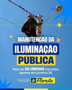 A Prefeitura de Floresta, por meio da Secretaria Municipal de Planejamento, Obras e Serviços Públicos, está realizando uma ampla ação de manutenção da iluminação pública em todo o município. As equipes estão em campo diariamente, atendendo tanto a área urbana quanto a zona rural, com o objetivo de garantir mais segurança e qualidade de vida à população.