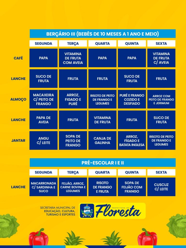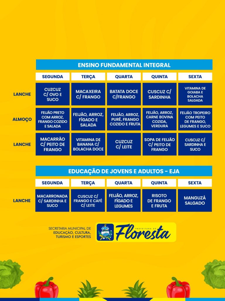 A Prefeitura de Floresta, por meio da Secretaria Municipal de Educação, Cultura, Turismo e Esportes, reafirma seu compromisso com o bem-estar dos estudantes através de uma política rigorosa de segurança alimentar. Atualmente, os cardápios da Rede Municipal de Ensino são planejados semanalmente para atender às necessidades específicas de cada etapa escolar, desde os berçários e creches até o Ensino Fundamental e a Educação de Jovens e Adultos (EJA).