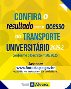 A Prefeitura de Floresta, através da Secretaria Municipal de Educação, Cultura, Turismo e Esportes, informa que o resultado do processo seletivo para o acesso ao Transporte Gratuito Universitário referente ao segundo semestre de 2025 já está disponível. Os interessados podem consultar as listas no site oficial da Prefeitura de Floresta e por meio do link na biografia do Instagram oficial: @prefeituraflorestape.