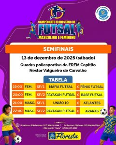 A Prefeitura de Floresta, por meio da Secretaria Municipal de Educação, Cultura, Turismo e Esportes, informa que as semifinais do Campeonato Florestano de Futsal Feminino e Masculino acontecem no dia 13 de dezembro de 2025 (sábado), na quadra poliesportiva da EREM Capitão Nestor Valgueiro de Carvalho. O evento reunirá as equipes classificadas nas categorias masculina e feminina, prometendo confrontos de alto nível e grande participação do público.A gestão municipal convida toda a comunidade a prestigiar as partidas, incentivar os atletas e participar deste momento esportivo tão importante para o município.