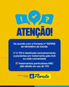 A Prefeitura de Floresta, através da Secretaria Municipal de Saúde, reforça a importância de que os pacientes fiquem atentos às normas e prazos para garantir o acesso adequado ao serviço de TFD.